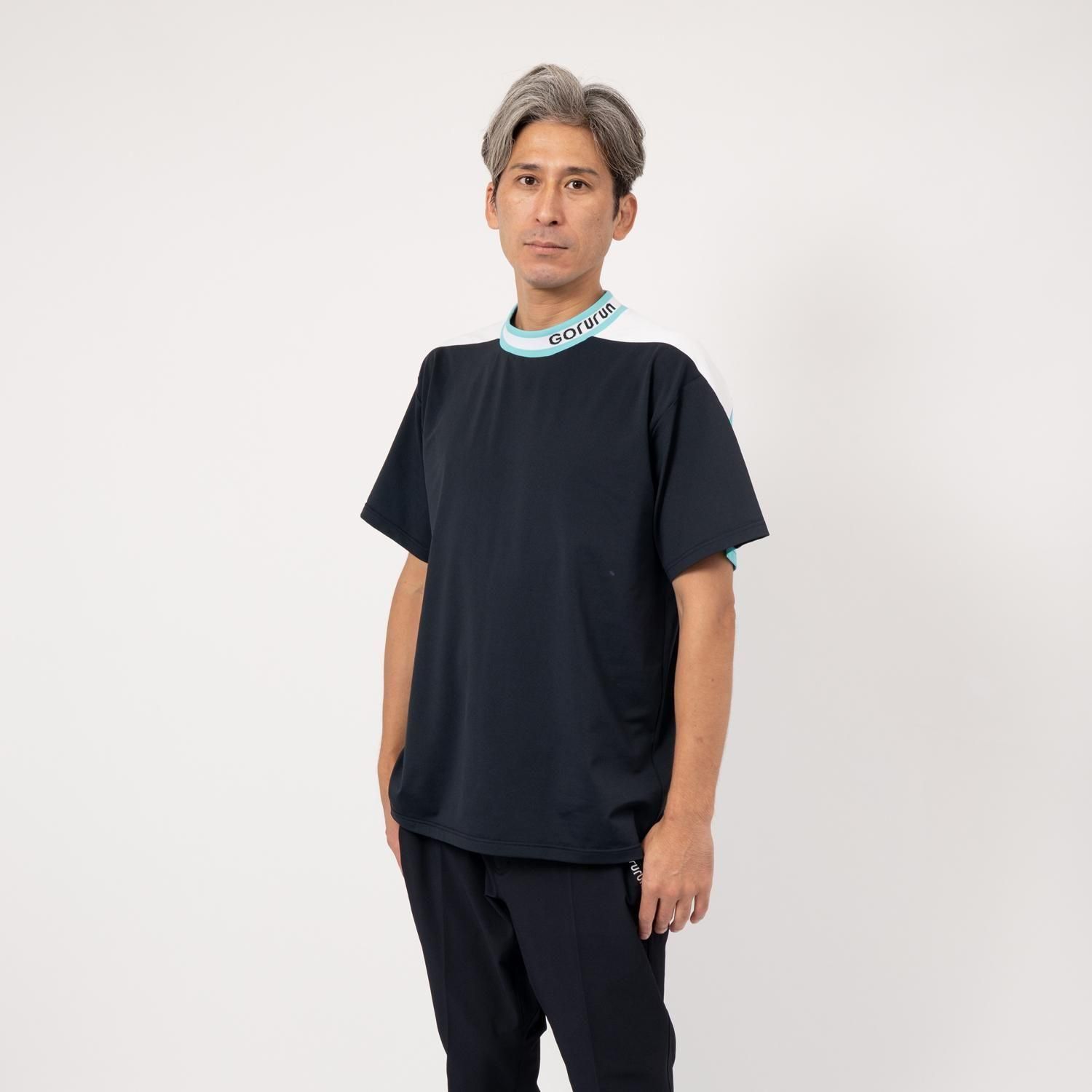配色切り替えジャガードリブが目を引くモックネックTシャツ。